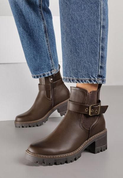 Brązowe Botki w Stylu Sztybletów na Niskim Obcasie z Paskiem ze Sprzączką Lathorie