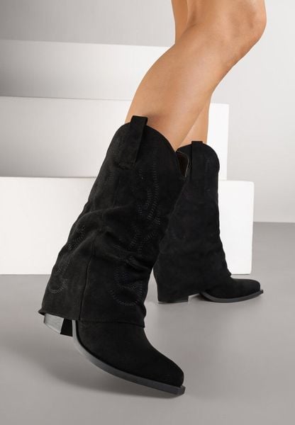 Czarne Marszczone Botki Kowbojki na Stożkowym Obcasie z Wywiniętą Cholewką Ahellia