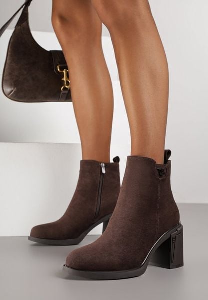 Ciemnobrązowe Botki do Kostki VICES na Słupkowym Obcasie z Aplikacją przy Cholewce Nelerie
