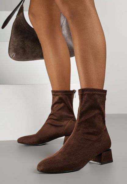 Brązowe Botki Vices na Klockowym Obcasie z Aplikacją i Skarpetkową Cholewką Ravite