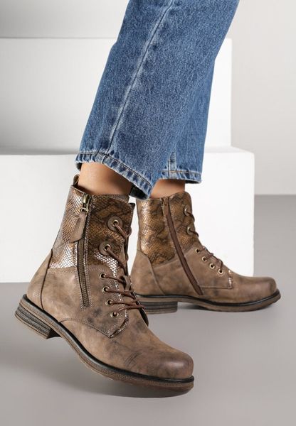 Brązowe Botki Workery Zdobione Suwakiem i Wężowym Tłoczeniem Vemindra