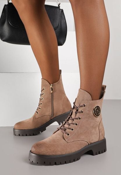 Beżowe Botki Potocki Workery z Geometryczną Ozdobą Firiselle