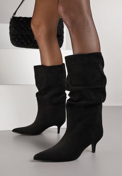 Czarne Marszczone Botki na Obcasie Typu Kaczuszka Nalonia