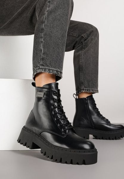 Czarne Sznurowane Botki na Platformie w Stylu Workerów z Aplikacją Kryształka Arrelae