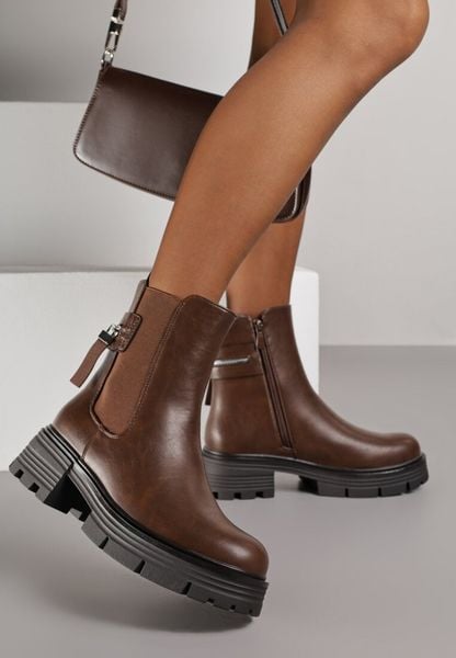 Brązowe Botki Typu Sztyblety na Platformie Ozdobione Aplikacją Nemalea