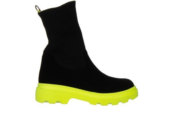Botki marki Bayla wykonane z naturalnej skóry zamszowej w kolorze czarnym.Botki z wyższą cholewką z elastycznego materiału idealnie dopasowują się do nogi. Buty są łatwe w zakładaniu. Na tylnej części cholewki żółty pasek zakończony uchwytem w postaci kółka. Botki na wygodnej podeszwie, która została wykonana z antypoślizgowej gumy w kolorze neonowożółtym. Wkładka oraz wyściółka ocieplane. […]