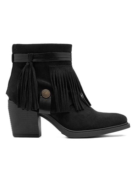 – zapięcie: suwak- noski: w szpic- noski i zapiętki: wzmocnione- detale: frędzle- forma obcasa: blokowy- podeszwa: antypoślizgowa