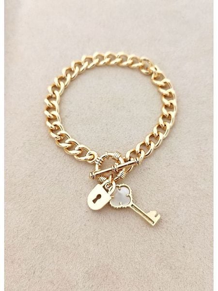 – materiał: mosiądz- powłoka: złoto- typ łańcuszka: ankier- zapięcie: kneblowe- rodzaj kamienia: masa perłowa- kolor kamienia: biały- element ozdobny: kluczWskazówka: Zdjęcie produktu w powiększeniu.