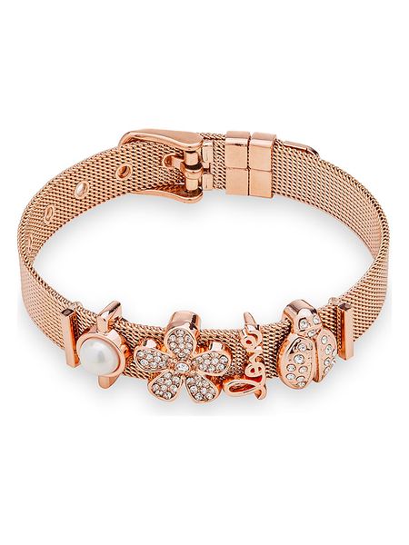 – materiał: stal szlachetna- powłoka: różowe złoto- zapięcie: sprzączka- rodzaj kamienia: kryształ- kolor kamienia: biały- element ozdobny: pismo, motyw zwierzęcy, kwiaty- regulacja długości: takWskazówka: Zdjęcie produktu w powiększeniu.