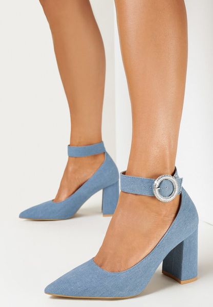 Jasnoniebieskie Czółenka na Słupku z Paskiem Przy Kostce i Ozdobnym Noskiem Forina