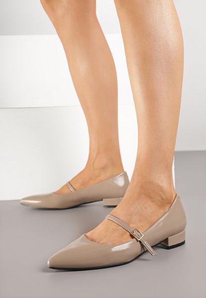 Ciemnobeżowe Lakierowane Balerinki Vices ze Skórzaną Wkładką i Paskiem Timaelle