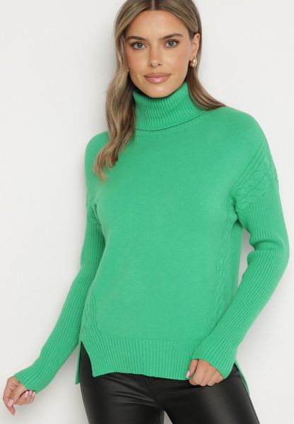 Zielony Klasyczny Golf z Dodatkiem Wiskozy i Bawełny Ozdobiony Rozcięciami po Bokach Ciasira