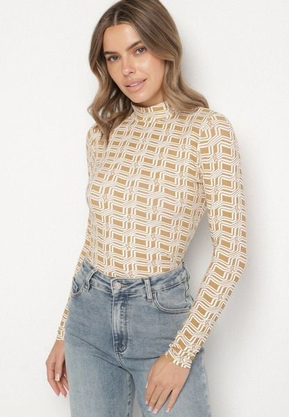 Biało-Brązowa Bawełniana Bluzka z Golfem i Długim Rękawem w Geometryczny Wzór Vilitila
