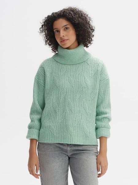 – kołnierz: golf- dolny brzeg: z rozcięciem- wzór splotu: warkocz- krój: luźny- look: jednokolorowy