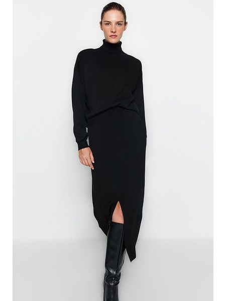 W zestawie:Golf:- kołnierz: golf- krój rękawów: nietoperz- ściągacz: kołnierz, zakończenia rękawów, dolny brzeg- krój: luźny- look: jednokolorowySpódnica:- wysokość pasa: high waist- pas / ściągacz: elastyczny- dolny brzeg: z rozcięciem- krój: prosty- look: jednokolorowy