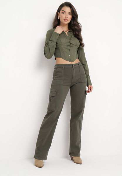 Ciemnozielone Jeansy o Fasonie Cargo z Szerokimi Kieszeniami Kabiana
