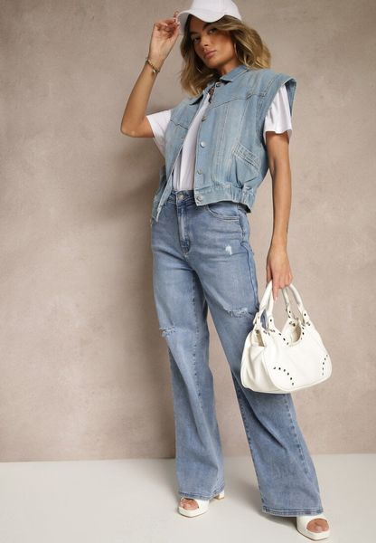 Niebieskie Jeansy High Waist z Szeroką Nogawką Zdobione Przetarciami Napinea