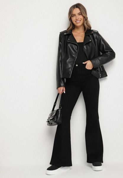 Czarne Szerokie Spodnie z Imitacji Skóry z Regularnym Stanem Lanasela