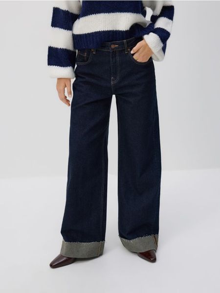 Jeansy o kroju wide leg, wykonane z bawełnianej tkaniny.