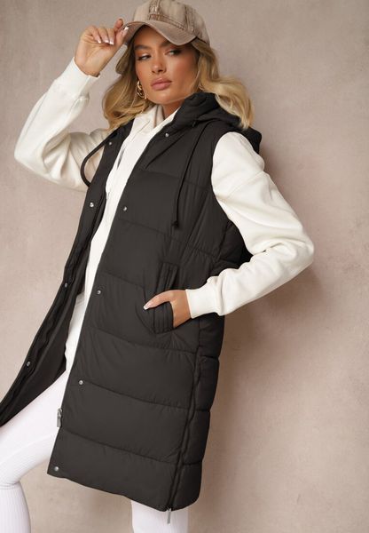 Czarna Kamizelka Pikowana z Kapturem Ozdobiona Sznurkami Eleandra