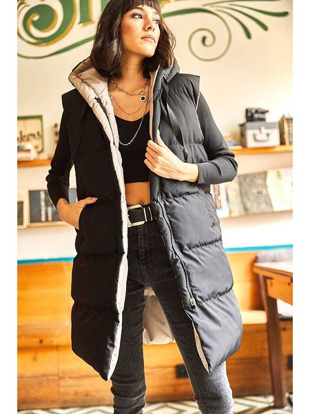 Beżowa Długa Kamizelka Pikowana Dwustronna ze Sznurkami przy Kapturze Frenila