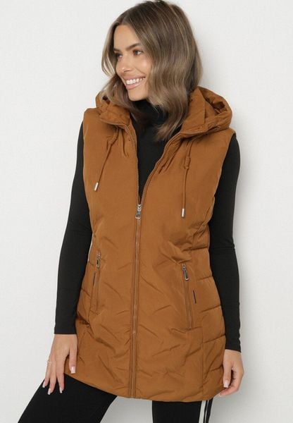 Brązowa Kamizelka Pikowana o Długim Kroju z Kapturem Zapinana na Suwak Terilenes