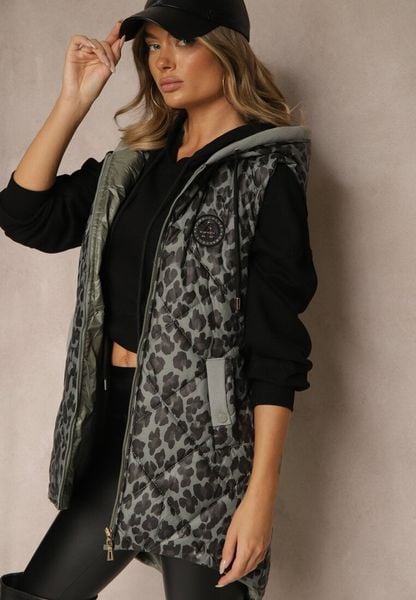Zielona Asymetryczna Kamizelka w Panterkę z Pikowanymi Przeszyciami Falasea