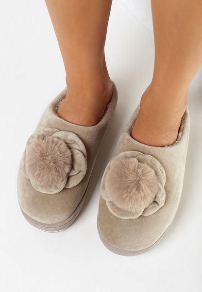 Ciemnobeżowe Kapcie Ozdobione Pomponem na Płaskiej Podeszwie Borvalka