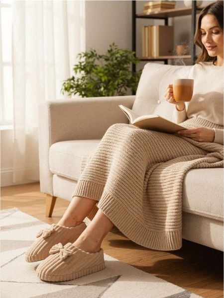Prążkowane kapcie z ozdobną kokardką – beżowy