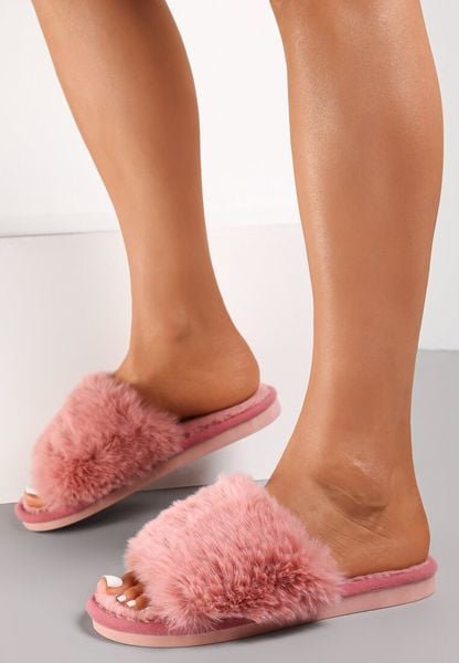 Kapcie Penthoreia płaskie, na grubej podeszwie z zaokrąglonym noskiem. Wsuwane, odkryte na palcach. Na palcach szeroki, puszysty pasek w dopasowanym kolorze. Pasek i wkładkę wykonano z imitacji futerka, a podeszwę z gumy. Futrzane kapcie umilą domowy relaks – noś je np. z bawełnianym T-shirtem i legginsami.