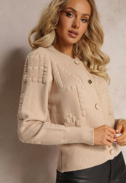 Jasnobeżowy Kardigan z Wiskozy Zapinany na Ozdobne Guziki ze Ściągaczami Zoekia