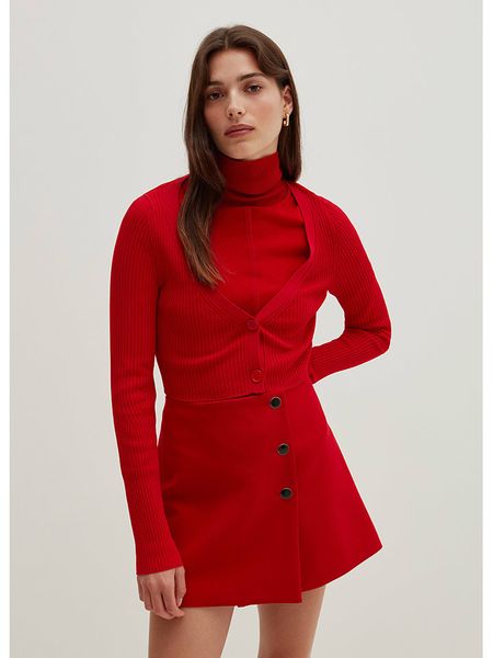 – dekolt: V- zapięcie: listwa guzikowa- krój: cropped- look: jednokolorowy, prążkowany