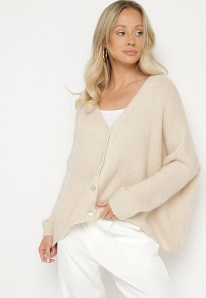 Jasnobeżowy Kardigan z Dekoltem w Serek z Dzianiny z Wełną i Moherem Lismio