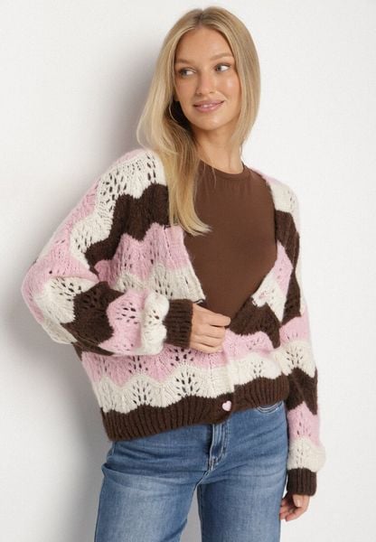 Różowy Wzorzysty Sweter Kardigan z Krótkim Rękawem z Dodatkiem Wełny Korivelle
