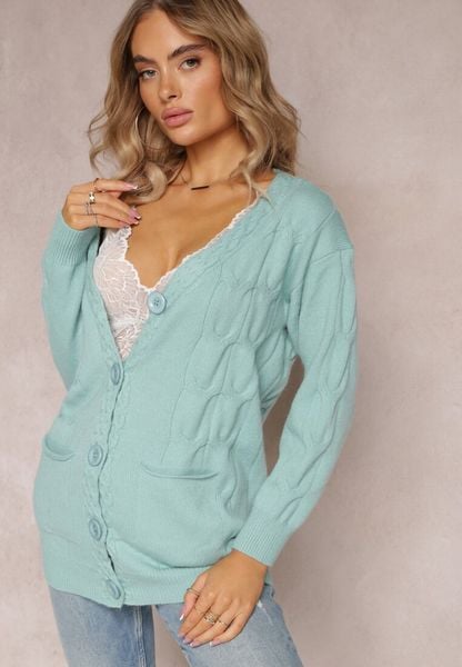 Miętowy Dzianinowy Kardigan z Tłoczeniami o Wydłużonym Fasonie z Kieszeniami Luittis