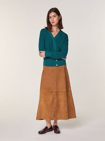 – czysta wełna merino- dekolt: V- zapięcie: listwa guzikowa- krój: prosty- look: jednokolorowy