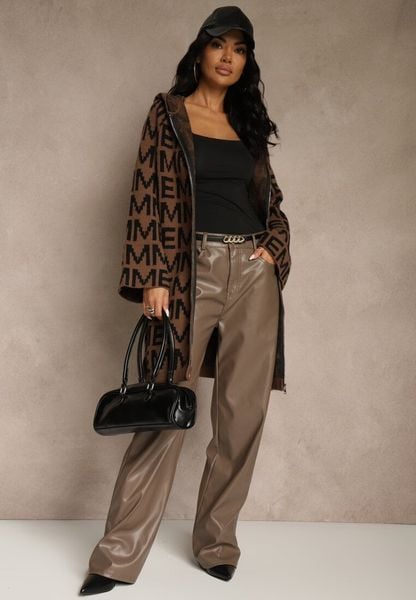 Brązowo-Czarny Kardigan na Suwak z Kapturem w Literowy Wzór Calitusa