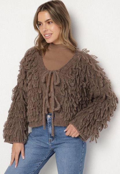 Brązowy Wiązany Kardigan z Dodatkiem Wełny i Wiskozy Zdobiony Frędzlami Tiravea