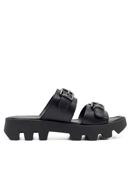 Czarne Klapki z Wyściółką z Imitacji Skóry na Płaskiej Podeszwie z Metalową Ozdobą Caloen