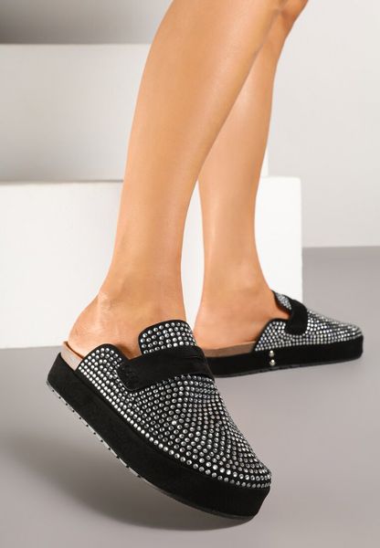 Czarne Klapki z Cyrkoniami na Cholewce i Paskiem Aluselle
