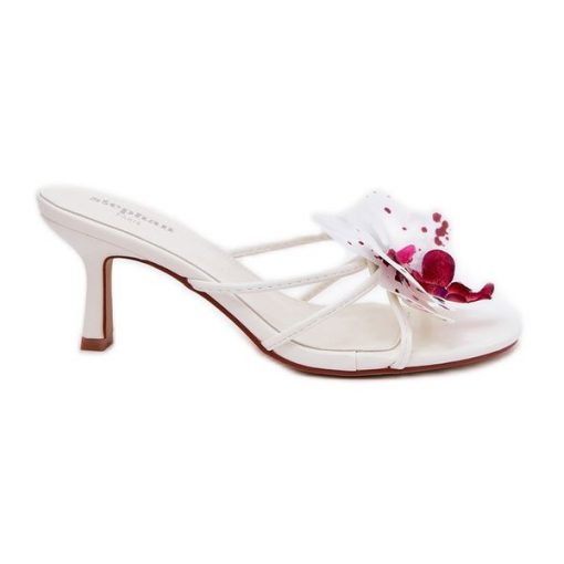 Klapki Damskie Na Szpilce Ze Sztucznym Kwiatem Białe