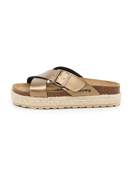– zapięcie: sprzączka- noski: otwarte- powierzchnia: z metalicznym połyskiem- wkładka: ergonomicznie formowana- forma obcasa: platforma- podeszwa: antypoślizgowa