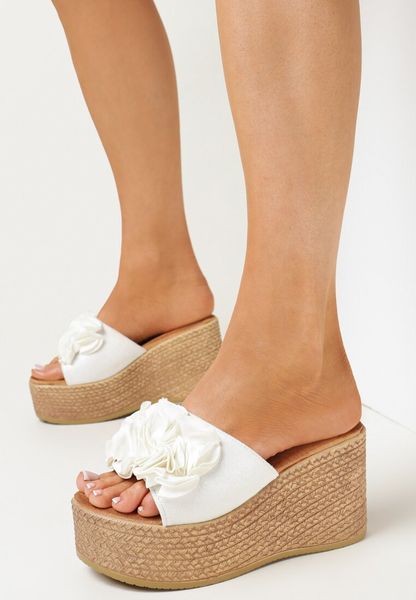 Białe Klapki na Plecionym Koturnie z Paskiem z Kwiatkami Faethea