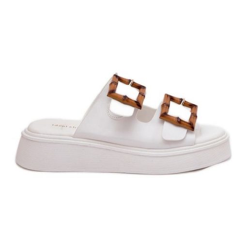 Eko Skórzane Klapki Damskie Na Platformie Z Klamrami Białe