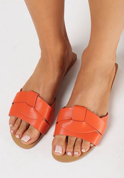 Pomarańczowe Płaskie Klapki z Wkładką ze Skóry Naturalnej i Ozdobnym Paskiem Ferani