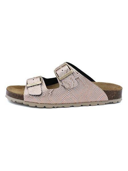 – skórzana wkładka: ergonomicznie formowana- powierzchnia: z metalicznym połyskiem- zapięcie: sprzączka- noski: otwarte- podeszwa: antypoślizgowa