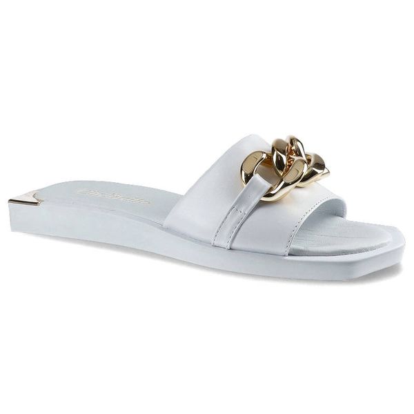 Klapki damskie Chebello, naturalna skóra licowa z szerokim paskiem ozdobionym metalowym łańcuchem oraz płaską podeszwą, białe, 2603-196-PSK