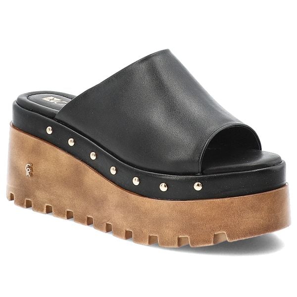 Klapki damskie Carinii, skórzane na wysokiej platformie z dżetami, czarne, B10048