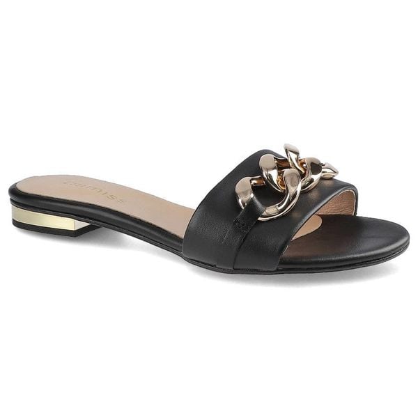 Klapki damskie Damiss, naturalna skóra licowa w czarnym kolorze z szerokim paskiem ozdobnym metalowym łańcuchem oraz niską płaską podeszwą z delikatn