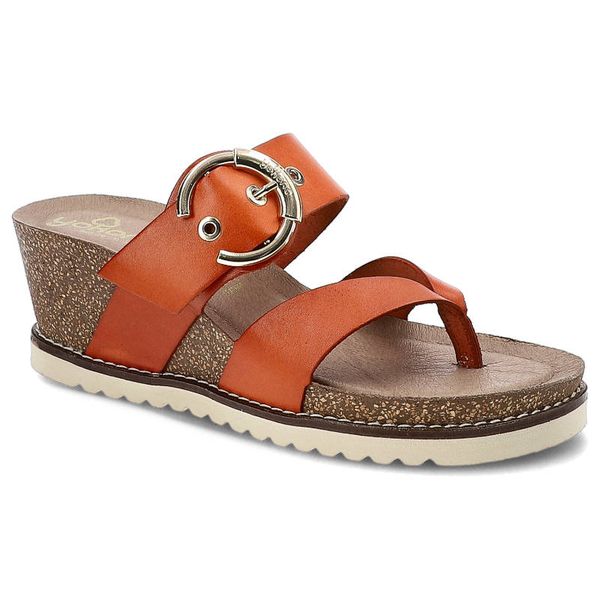 Klapki damskie Yokono, naturalna skóra licowa z szerokimi paskami na cholewce ozdobną klamrą oraz lekką podeszwą korkową, ceglane, Motril-022-Vaqueti
